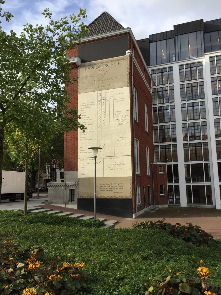This mural stands on the facade of the former National Education Museum (located here near the Boterslote from 1989 to 2012). Designed by the artist Toni Burgering as an ode to the writer Bob den Uyl, some call the mural “a curiosity.” Yet, publicity also includes an acknowledgment that it fits with the function of the building. Besides being once a museum of education, the building housed the public library and, today, is part of Erasmus University College. The report card enumerates recordkeeping and communication by teachers, administrators, and parents. Such a report could be a mark of hope for the future and actual and potential failures, though here it was meant to suggest the more felicitous path of writer den Uyl.