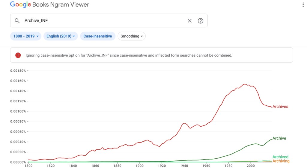 If you go to GoogleBooks, you can today begin to experiment yourself with the use of the words relating to archives, archive, and archiving. As Tulane’s reference librarian Victorian Elmwood noted, “Just playing around with it, I was able to return some interesting results about the appearance of a couple forms” of these words. The caveat here is “that this only reflects the contents of books published between 1500 and 2008 whose text is both contained in Google Books and is machine-readable.” That said, in the graph above, we can easily see something of the trend over the last two hundred years, which we can investigate in other ways as we go along.